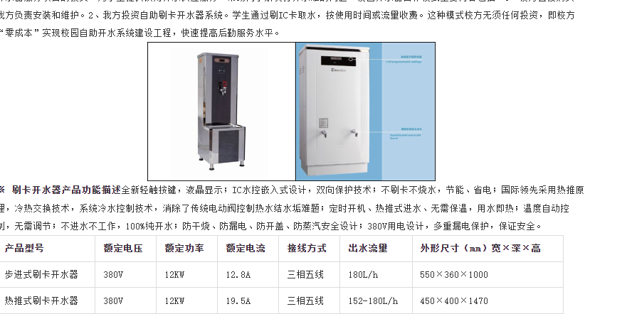 刷卡開水器產品功能描述全新輕觸按鍵,液晶顯示;IC水控嵌入式設計,雙向保護技